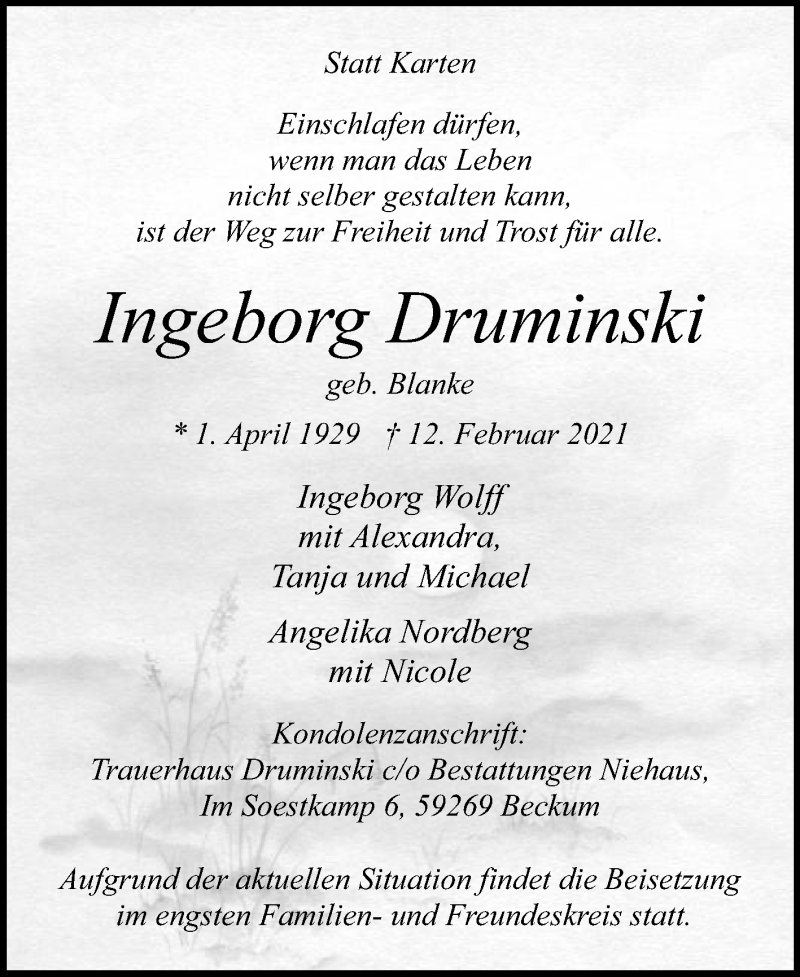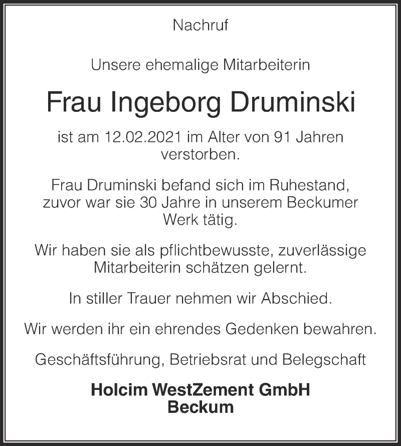 Hier finden Sie alle Traueranzeigen aus der Zeitung, die bisher für Ingeborg Druminski erschienen sind. Weitere Traueranzeigen, die in der Zeitung erscheinen, werden hier ebenfalls aufgelistet