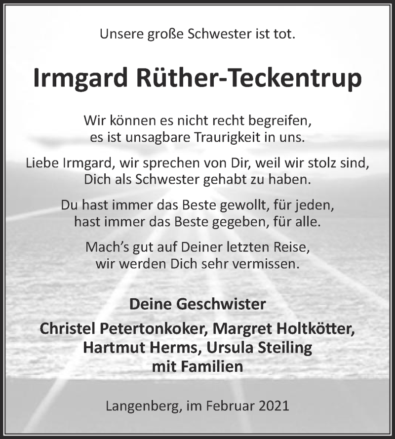 Hier finden Sie alle Traueranzeigen aus der Zeitung, die bisher für Irmgard Rüther-Teckentrup erschienen sind. Weitere Traueranzeigen, die in der Zeitung erscheinen, werden hier ebenfalls aufgelistet