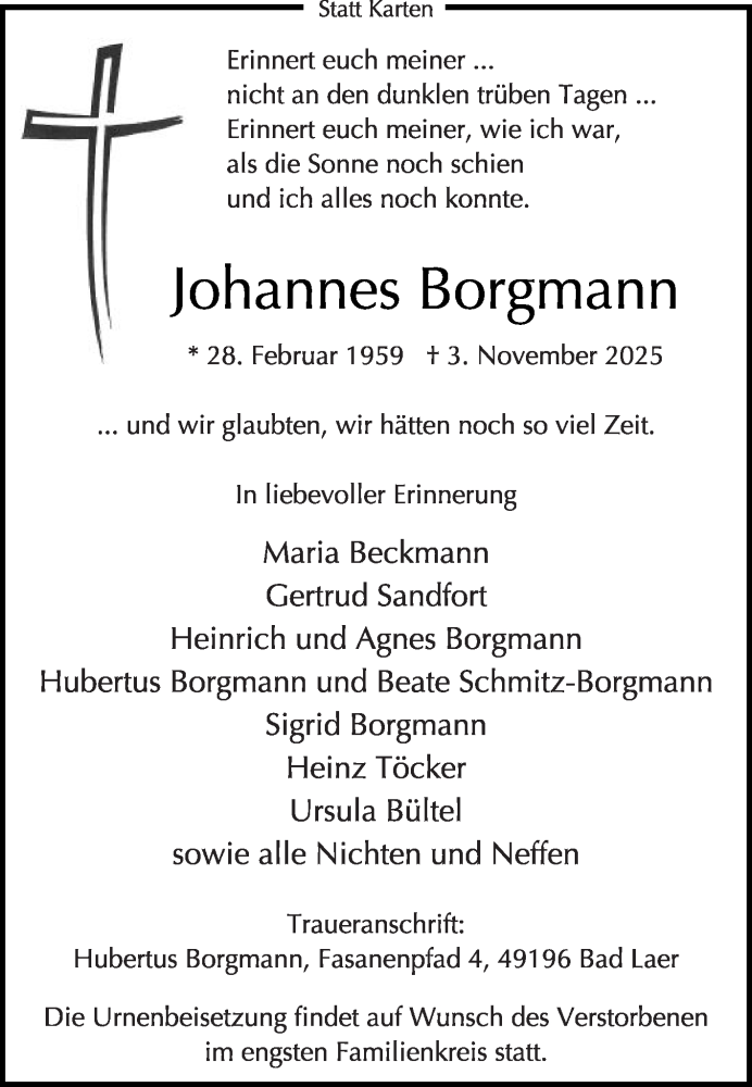Hier finden Sie alle Traueranzeigen aus der Zeitung, die bisher für Johannes Borgmann erschienen sind. Weitere Traueranzeigen, die in der Zeitung erscheinen, werden hier ebenfalls aufgelistet