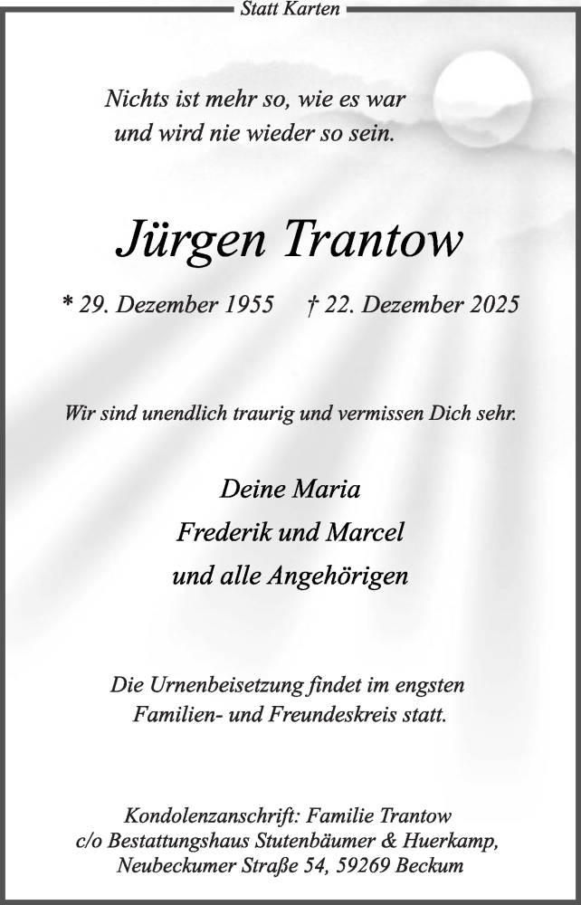 Hier finden Sie alle Traueranzeigen aus der Zeitung, die bisher für Jürgen Trantow erschienen sind. Weitere Traueranzeigen, die in der Zeitung erscheinen, werden hier ebenfalls aufgelistet