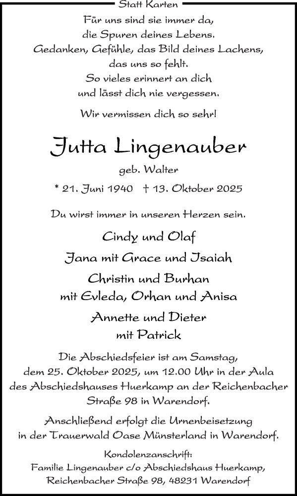 Hier finden Sie alle Traueranzeigen aus der Zeitung, die bisher für Jutta Lingenauber erschienen sind. Weitere Traueranzeigen, die in der Zeitung erscheinen, werden hier ebenfalls aufgelistet