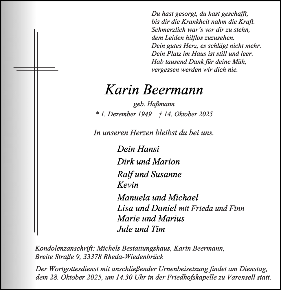 Hier finden Sie alle Traueranzeigen aus der Zeitung, die bisher für Karin Beermann erschienen sind. Weitere Traueranzeigen, die in der Zeitung erscheinen, werden hier ebenfalls aufgelistet