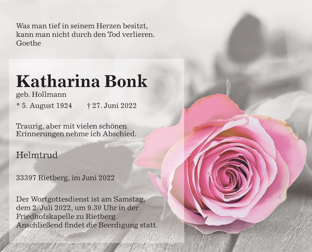 Hier finden Sie alle Traueranzeigen aus der Zeitung, die bisher für Katharina Bonk erschienen sind. Weitere Traueranzeigen, die in der Zeitung erscheinen, werden hier ebenfalls aufgelistet