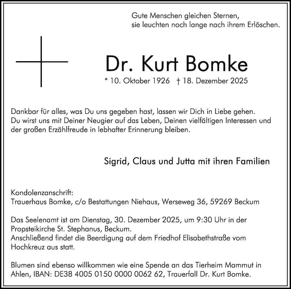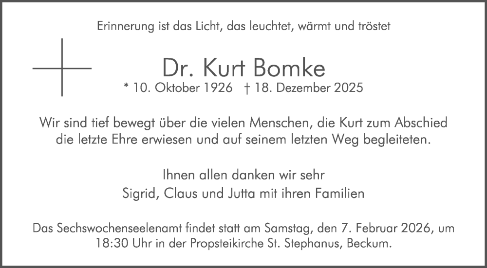 Hier finden Sie alle Traueranzeigen aus der Zeitung, die bisher für Kurt Bomke erschienen sind. Weitere Traueranzeigen, die in der Zeitung erscheinen, werden hier ebenfalls aufgelistet