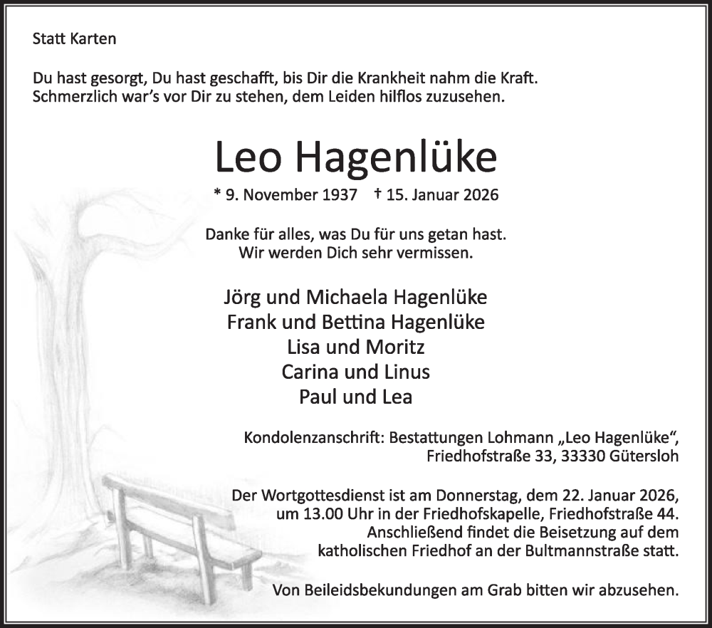 Hier finden Sie alle Traueranzeigen aus der Zeitung, die bisher für Leo Hagenlüke erschienen sind. Weitere Traueranzeigen, die in der Zeitung erscheinen, werden hier ebenfalls aufgelistet