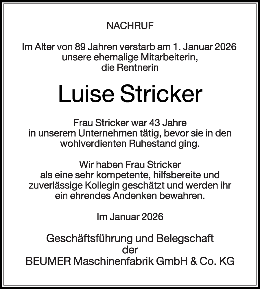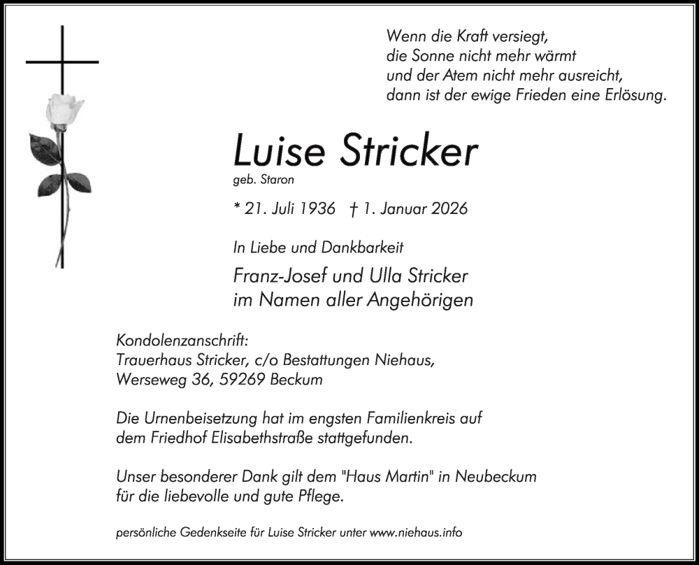 Hier finden Sie alle Traueranzeigen aus der Zeitung, die bisher für Luise Stricker erschienen sind. Weitere Traueranzeigen, die in der Zeitung erscheinen, werden hier ebenfalls aufgelistet