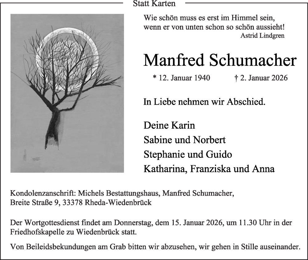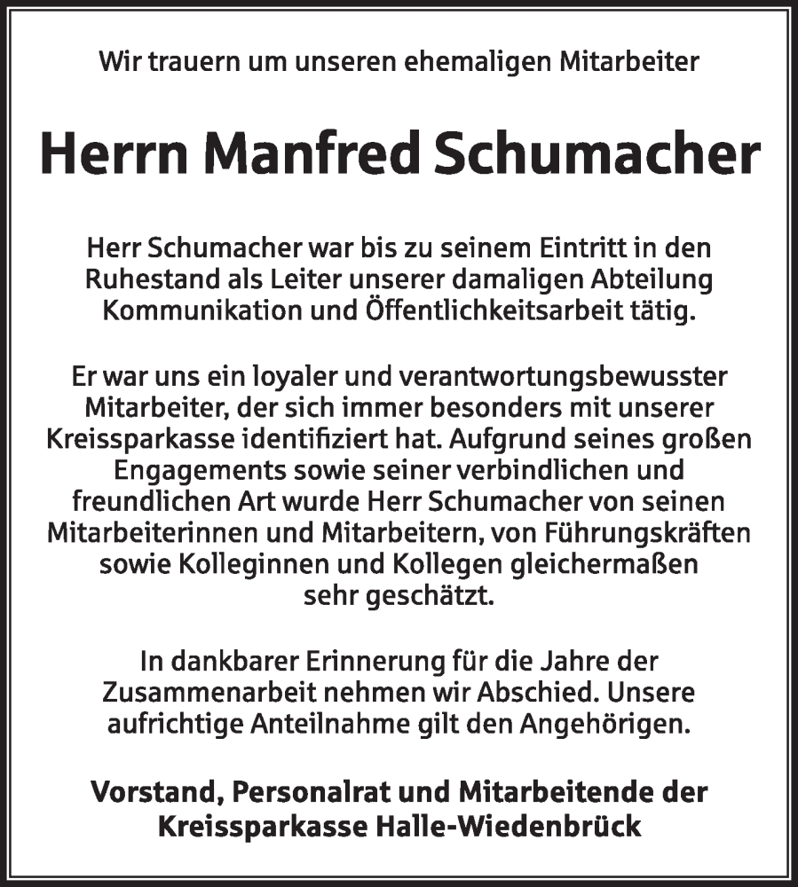 Hier finden Sie alle Traueranzeigen aus der Zeitung, die bisher für Manfred Schumacher erschienen sind. Weitere Traueranzeigen, die in der Zeitung erscheinen, werden hier ebenfalls aufgelistet