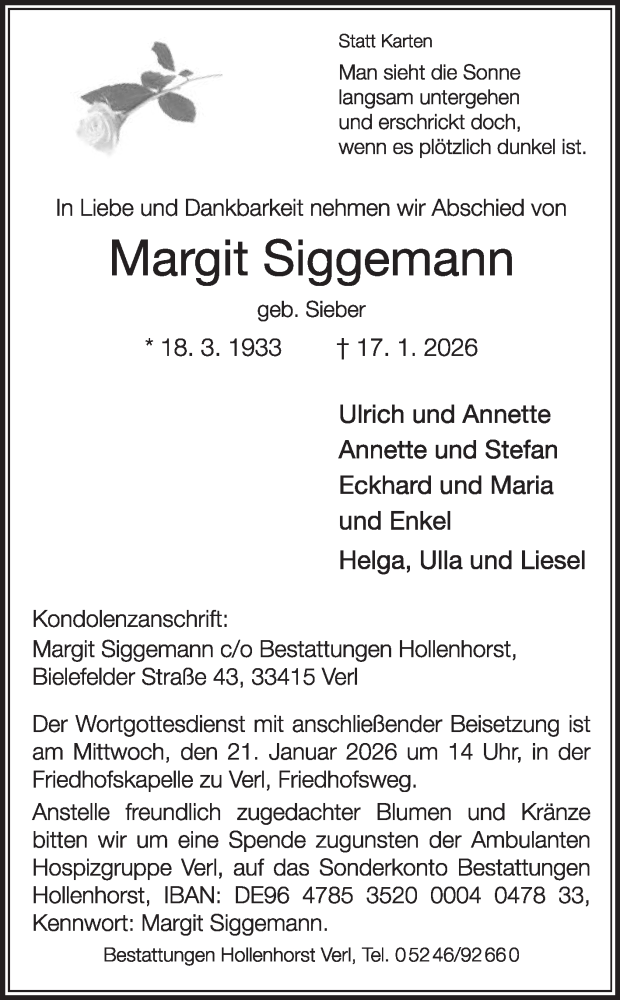 Hier finden Sie alle Traueranzeigen aus der Zeitung, die bisher für Margit Siggemann erschienen sind. Weitere Traueranzeigen, die in der Zeitung erscheinen, werden hier ebenfalls aufgelistet