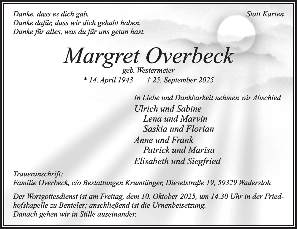Hier finden Sie alle Traueranzeigen aus der Zeitung, die bisher für Margret Overbeck erschienen sind. Weitere Traueranzeigen, die in der Zeitung erscheinen, werden hier ebenfalls aufgelistet
