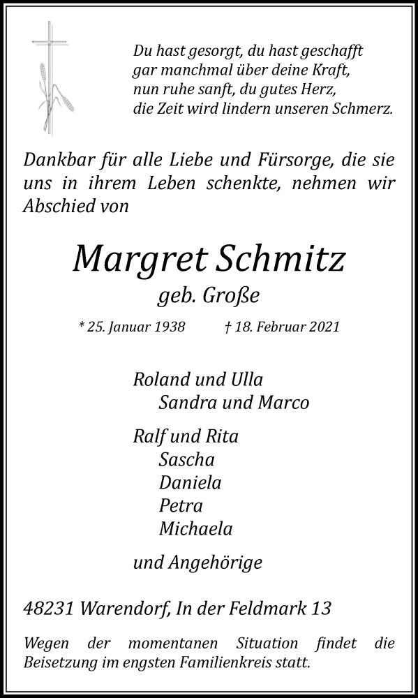 Hier finden Sie alle Traueranzeigen aus der Zeitung, die bisher für Margret Schmitz erschienen sind. Weitere Traueranzeigen, die in der Zeitung erscheinen, werden hier ebenfalls aufgelistet