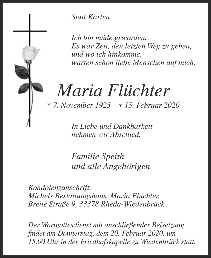 Hier finden Sie alle Traueranzeigen aus der Zeitung, die bisher für Maria Flüchter erschienen sind. Weitere Traueranzeigen, die in der Zeitung erscheinen, werden hier ebenfalls aufgelistet