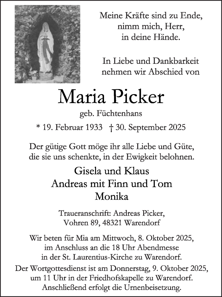 Hier finden Sie alle Traueranzeigen aus der Zeitung, die bisher für Maria Picker erschienen sind. Weitere Traueranzeigen, die in der Zeitung erscheinen, werden hier ebenfalls aufgelistet