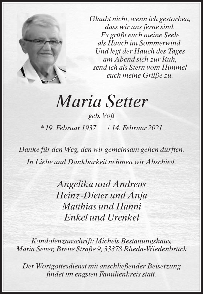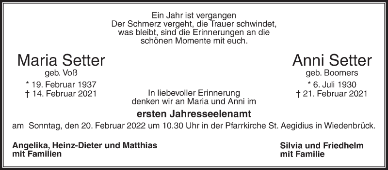 Hier finden Sie alle Traueranzeigen aus der Zeitung, die bisher für Maria Setter erschienen sind. Weitere Traueranzeigen, die in der Zeitung erscheinen, werden hier ebenfalls aufgelistet
