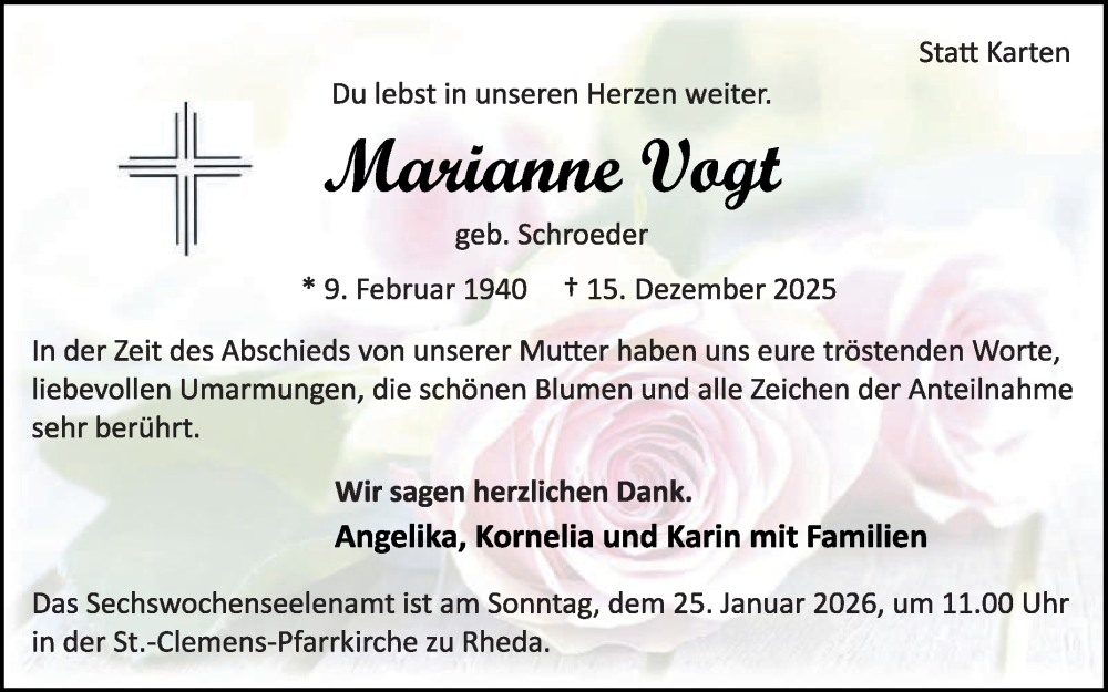 Hier finden Sie alle Traueranzeigen aus der Zeitung, die bisher für Marianne Vagt erschienen sind. Weitere Traueranzeigen, die in der Zeitung erscheinen, werden hier ebenfalls aufgelistet