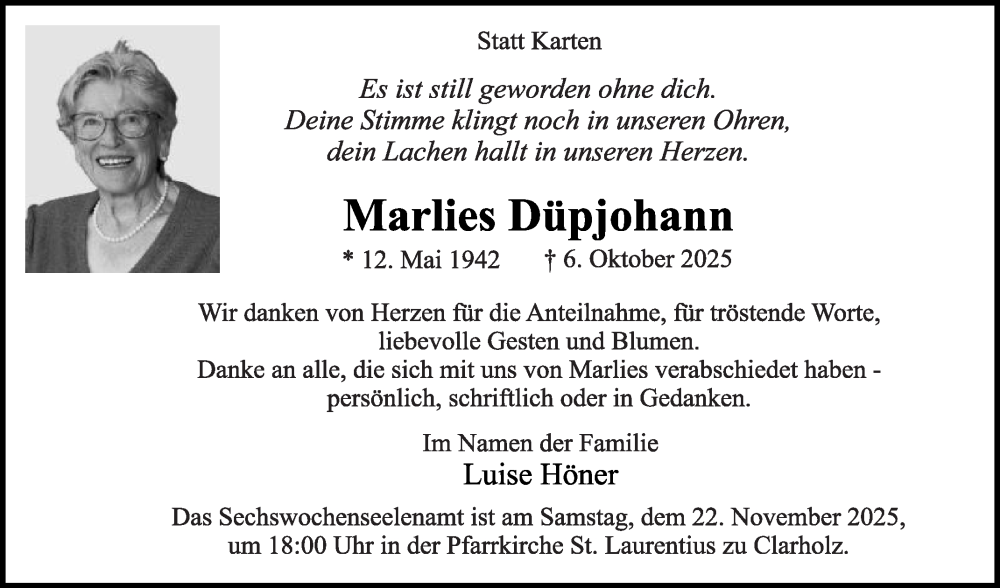 Hier finden Sie alle Traueranzeigen aus der Zeitung, die bisher für Marlies Düpjohann erschienen sind. Weitere Traueranzeigen, die in der Zeitung erscheinen, werden hier ebenfalls aufgelistet
