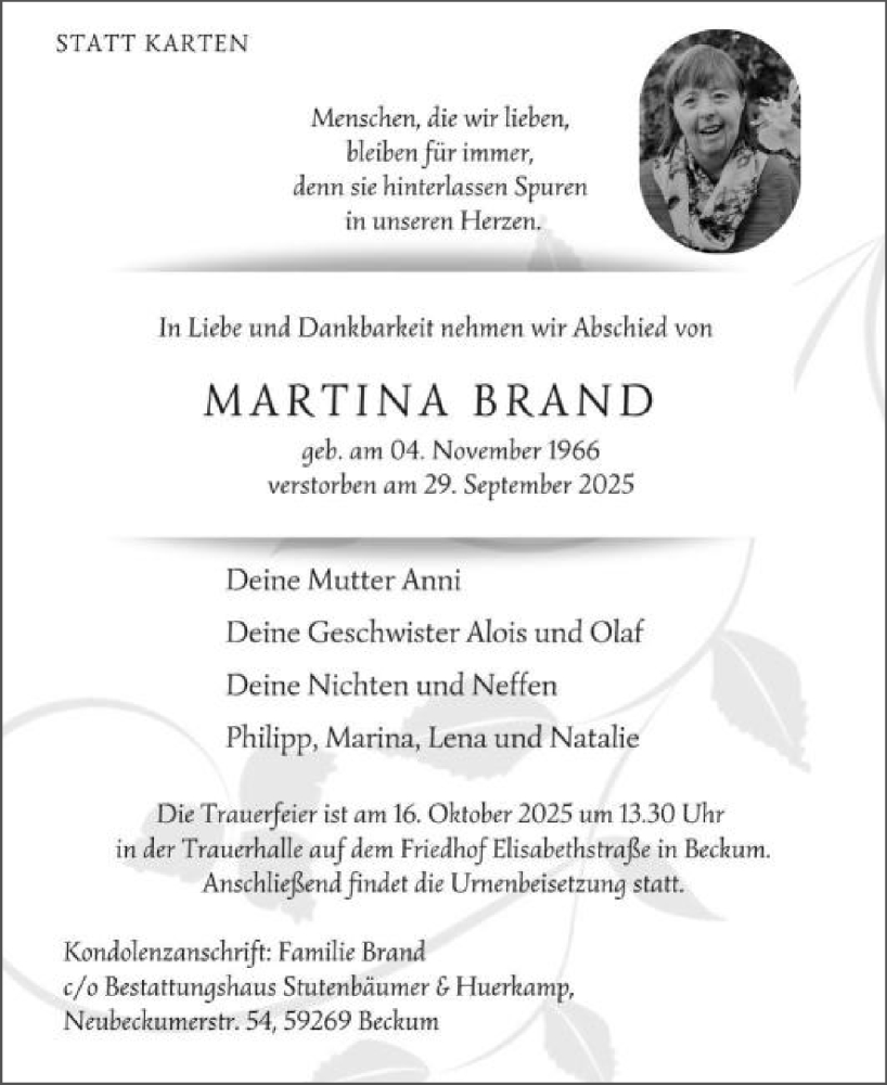 Hier finden Sie alle Traueranzeigen aus der Zeitung, die bisher für Martina Brand erschienen sind. Weitere Traueranzeigen, die in der Zeitung erscheinen, werden hier ebenfalls aufgelistet