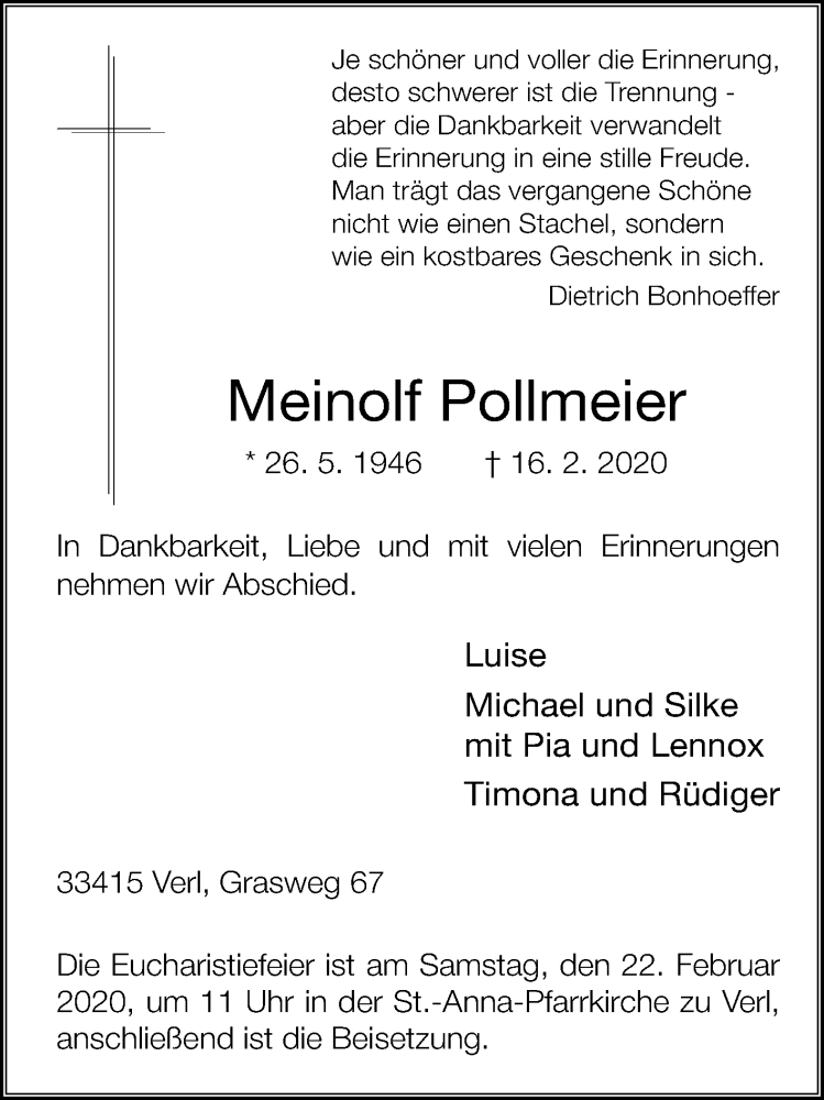 Hier finden Sie alle Traueranzeigen aus der Zeitung, die bisher für Meinolf Pollmeier erschienen sind. Weitere Traueranzeigen, die in der Zeitung erscheinen, werden hier ebenfalls aufgelistet