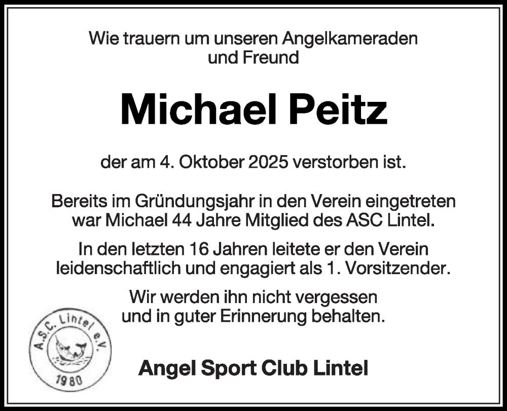 Hier finden Sie alle Traueranzeigen aus der Zeitung, die bisher für Michael Peitz erschienen sind. Weitere Traueranzeigen, die in der Zeitung erscheinen, werden hier ebenfalls aufgelistet