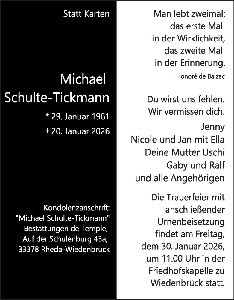 Hier finden Sie alle Traueranzeigen aus der Zeitung, die bisher für Michael Schulte-Tickmann erschienen sind. Weitere Traueranzeigen, die in der Zeitung erscheinen, werden hier ebenfalls aufgelistet