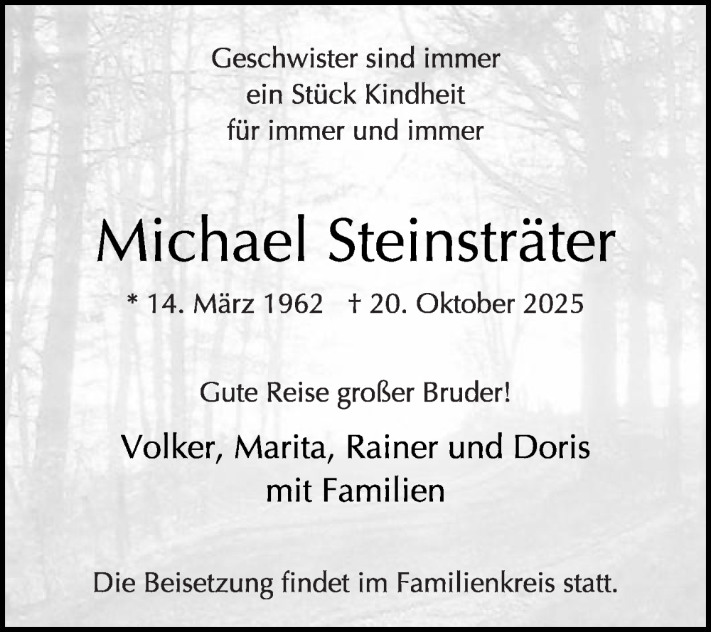 Hier finden Sie alle Traueranzeigen aus der Zeitung, die bisher für Michael Steinsträter erschienen sind. Weitere Traueranzeigen, die in der Zeitung erscheinen, werden hier ebenfalls aufgelistet