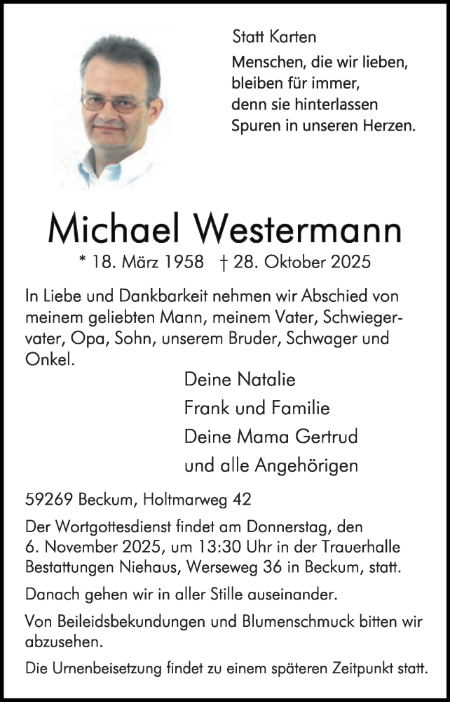 Hier finden Sie alle Traueranzeigen aus der Zeitung, die bisher für Michael Westermann erschienen sind. Weitere Traueranzeigen, die in der Zeitung erscheinen, werden hier ebenfalls aufgelistet