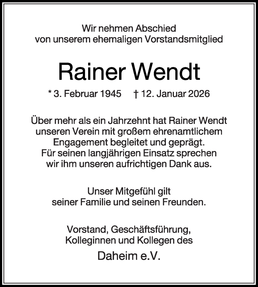 Hier finden Sie alle Traueranzeigen aus der Zeitung, die bisher für Rainer Wendt erschienen sind. Weitere Traueranzeigen, die in der Zeitung erscheinen, werden hier ebenfalls aufgelistet