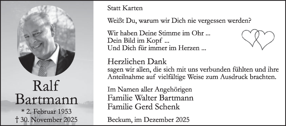 Hier finden Sie alle Traueranzeigen aus der Zeitung, die bisher für Ralf Bartmann erschienen sind. Weitere Traueranzeigen, die in der Zeitung erscheinen, werden hier ebenfalls aufgelistet