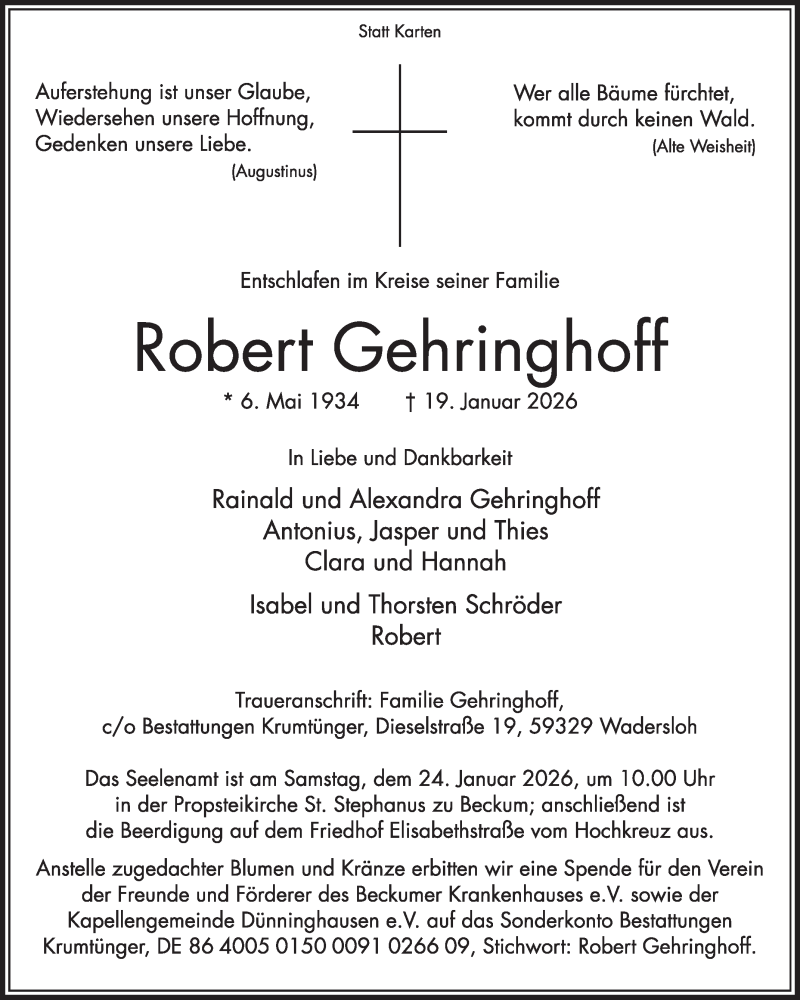 Hier finden Sie alle Traueranzeigen aus der Zeitung, die bisher für Robert Gehringhoff erschienen sind. Weitere Traueranzeigen, die in der Zeitung erscheinen, werden hier ebenfalls aufgelistet