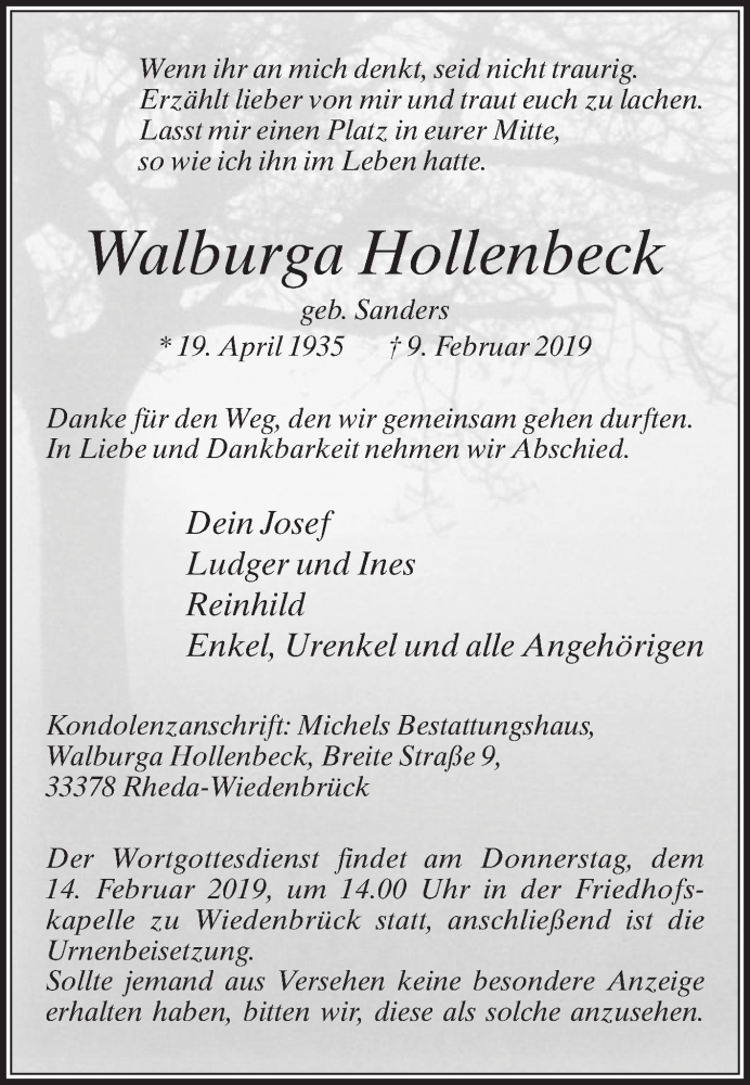 Hier finden Sie alle Traueranzeigen aus der Zeitung, die bisher für Walburga Hollenbeck erschienen sind. Weitere Traueranzeigen, die in der Zeitung erscheinen, werden hier ebenfalls aufgelistet