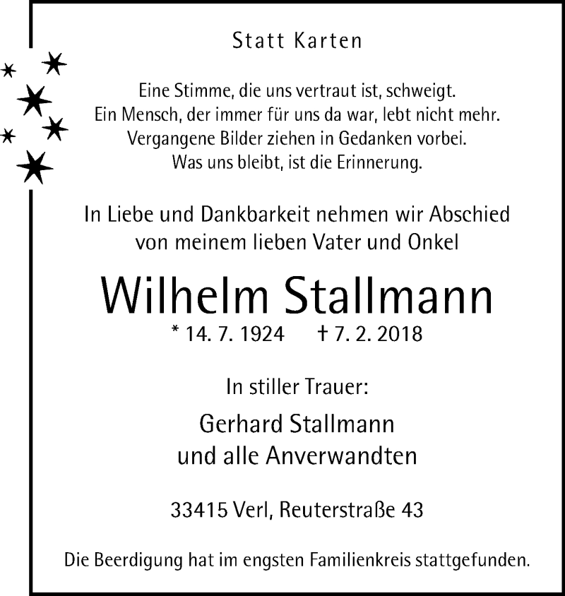 Hier finden Sie alle Traueranzeigen aus der Zeitung, die bisher für Wilhelm Stallmann erschienen sind. Weitere Traueranzeigen, die in der Zeitung erscheinen, werden hier ebenfalls aufgelistet